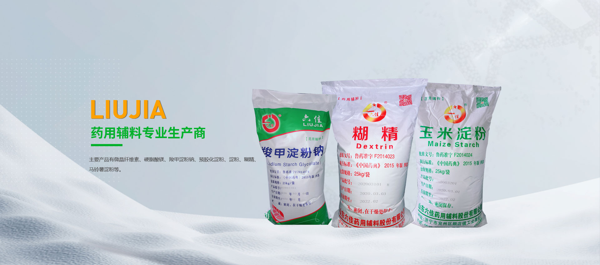 山東六佳藥用輔料股份有限公司 我公司成立于1997年,專業(yè)生產(chǎn)藥用輔料,現(xiàn)主要產(chǎn)品有微晶纖維素、硬脂酸鎂、羧甲淀粉鈉、預膠化淀粉、淀粉、糊精等。